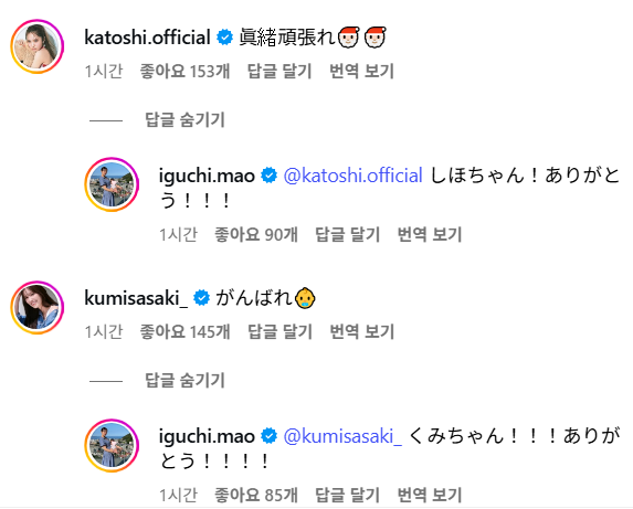댓글로 각가 마오 힘내, 힘내를 남긴 카토 시호와 사사키 쿠미 그리고 두 사람의 댓글에 각각 시호쨩! 고마워!!!, 쿠미쨩!!! 고마워!!!! 를 대댓글로 남긴 이구치 마오입니다.
